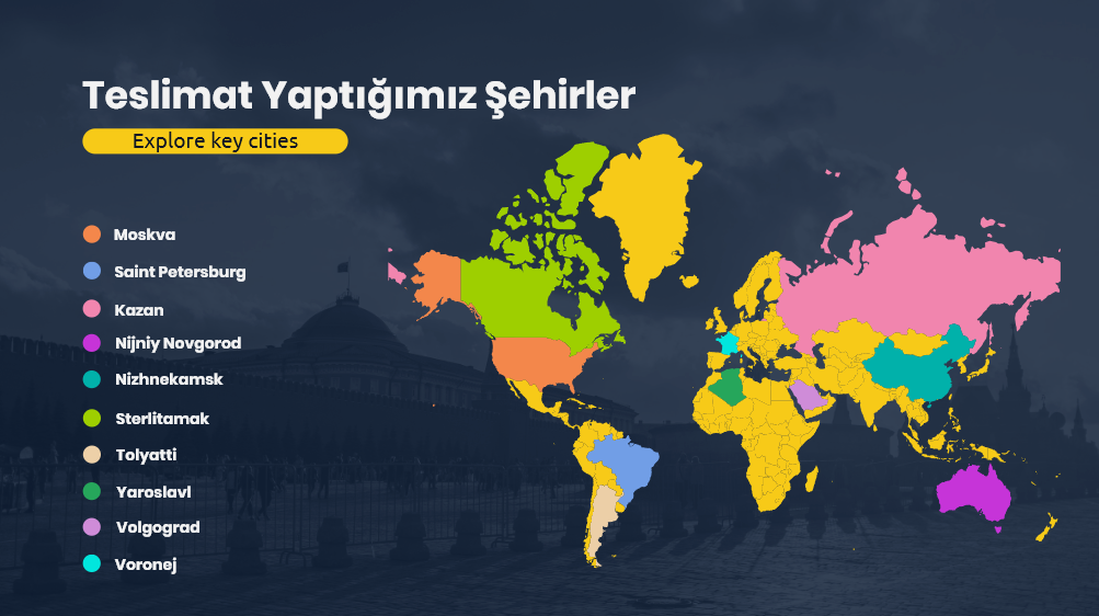Moskova, Saint Petersburg, Kazan, Nijniy Novgorodi, Nizhnekamsk, Sterlitamak, Tolyatti, Yaroslavl, Volgograd, Voronej, Omsk, Yekateringburg, Krasnoyarsk, Rostov-na-Donu, Novosibirsk, Voronej, Çelyabinsk